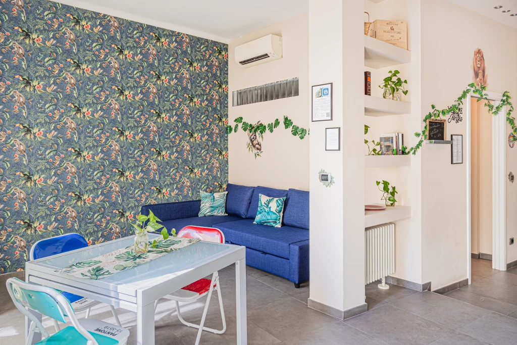 Questo comodissimo appartamento, dotato di ogni comfort, è adatto a qualsiasi tipo di soggiorno e può accogliere fino a quattro persone grazie alla presenza di un comodo divano letto in salotto. Quando chiuso, il divano diventa un’elegante seduta perfetta per rilassarsi davanti alla TV, che, essendo smart, offre l’accesso a Netflix e molte altre applicazioni per le vostre serate in tranquillità.