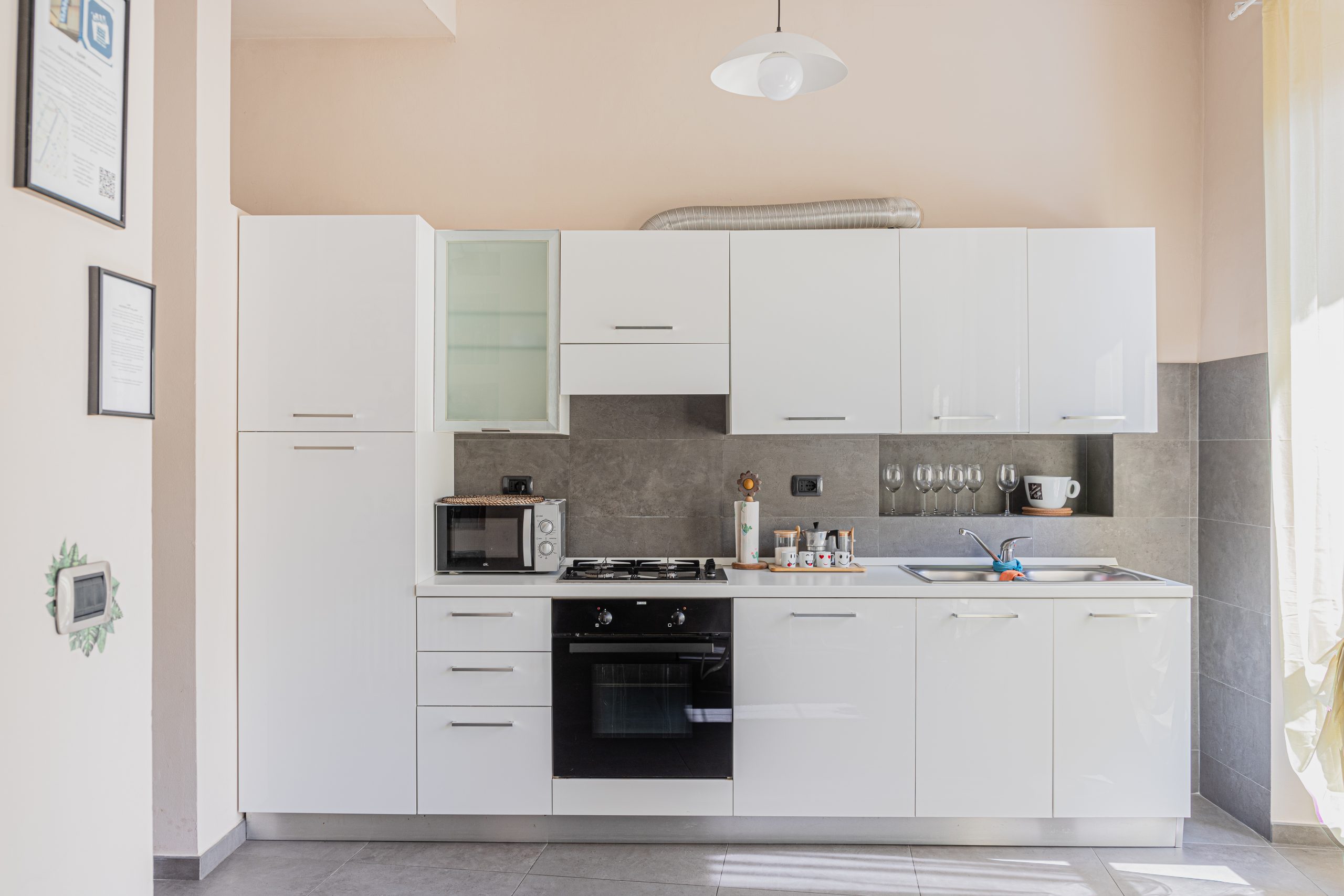 La cucina è completamente accessoriata con tutto il necessario: forno, lavastoviglie, microonde, tovagliato, piatti, posate e molto altro.